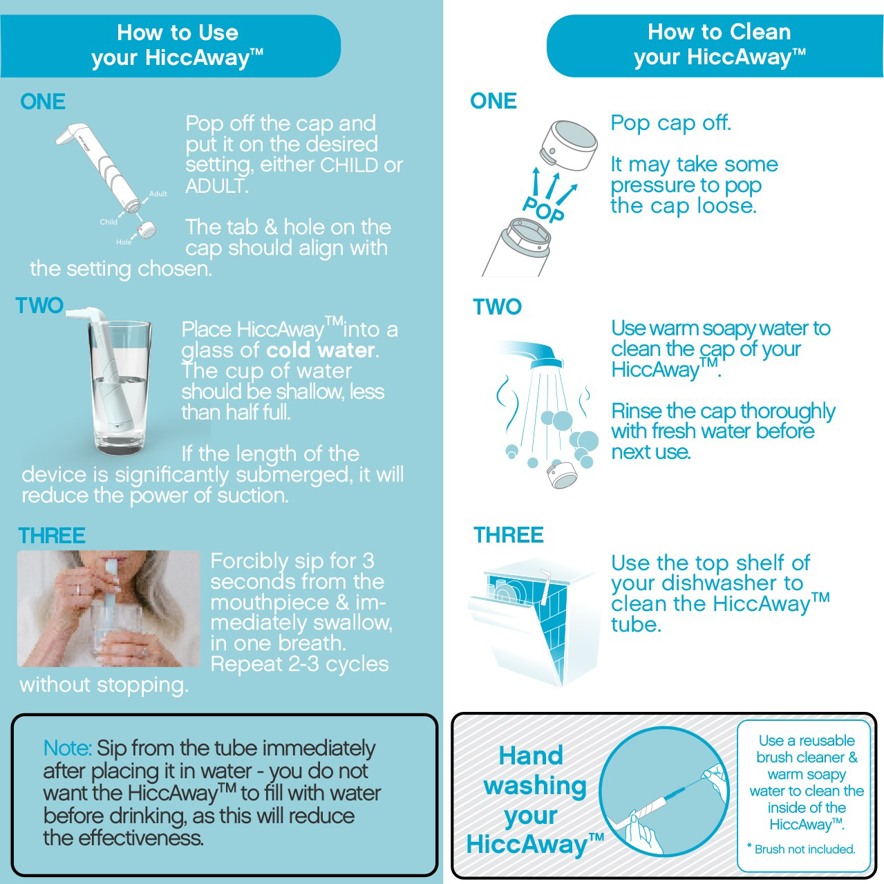 HiccAway is the a clinically proven device that stops hiccups fast. HiccAway was invented by Dr. Seifi, a physician. The cap can be adjusted to ADULT or CHILD (up to 20 kg). Insert HiccAway into a shallow glass of water and sip forcefully to stop hiccups fast. Patented 100% Money-Back Guarantee Dishwasher safe Made in USA As seen on Shark Tank For all ages Compact/Portable and Reusable Clinically Proven Backed by science, published in Journal of American Medical Assocation (JAMA) and National Geographic!